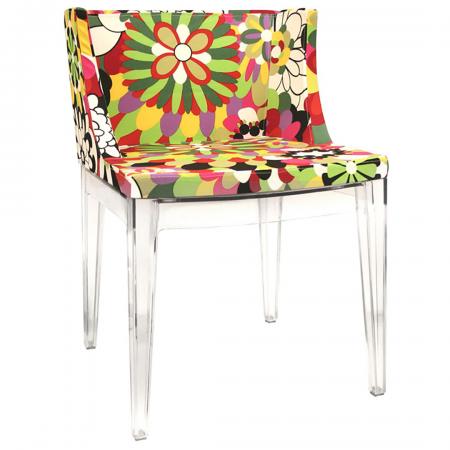 DC-493 Acrylic Chair This acrylic accent chair is colorful and will brighten your living space to the highest degree! With a fabric seat in vivid multicolor hues such as pink, red, green, purple, white, yellow, and black, this modern piece will be the star of the show. The legs are clear transparent acrylic, and the construction of the seat is done in wood with firm high-density foam cushions.