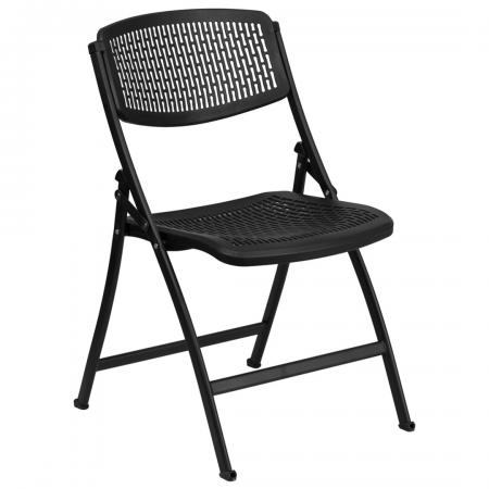 • Multi-Purpose Plastic Folding Chair • 990 lb. Weight Capacity • Ergonomically Contoured Design • Conforms to Body Shape • Extra Wide Seat • Breathable Perforated Seat and Back • Black Polypropylene Seat and Back • High Impact Grade Construction • Double Support Rails • Heavy Duty Metal Frame • Material: Polypropylene, Steel • Finish: Black Powder Coat • Dimension : 19"W x 20.5"D x 33"H |